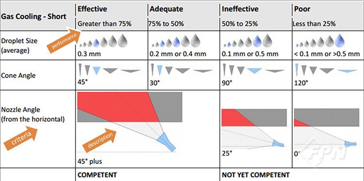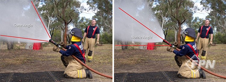 반대로 노즐 앵글이 25°일 경우 대부분의 물방울은 미연소 가스가 아닌 바닥에 주수된다. 그 결과 가스 냉각의 정도는 25% 미만의 효율을 달성한 것으로 평가된다. ‘물방울 크기’, ‘콘 앵글(관창 말단에서 분무 주수되는 각도)’과 같은 다른 기준에서도 비슷한 구분이 만들어진다.