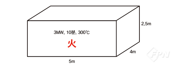 위 그림과 같은 체적이 50㎥인 격실에 HRR 3MW의 화재가 10분 동안 지속된 후 실내온도가 300℃가 됐을 때 소방대가 현장에 도착했다. 지휘자가 간접공격 전술을 택했다고 가정하고 냉각 소화(Gas cooling)의 효과만을 고려해 화재진압에 필요한 물의 양과 시간을 구해보자.
