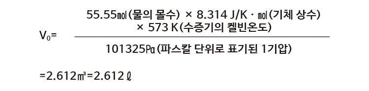 위 계산에서 최종 수증기 온도는 300℃(573K)였다. 이는 다음과 같은 양의 수증기 부피로 계산된다.