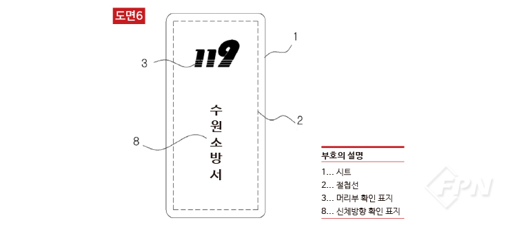 족부 확인 표지(7)는 [도면 3]과 같이 발, 구두 형상 로고로 제작하거나 [도면 4], [도면 5]와 같이 소방관서명, 전화번호 등의 연락처 같은 문자, 숫자 중 하나 또는 적어도 하나 이상의 조합으로 만들 수도 있다.