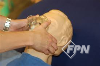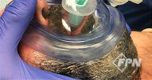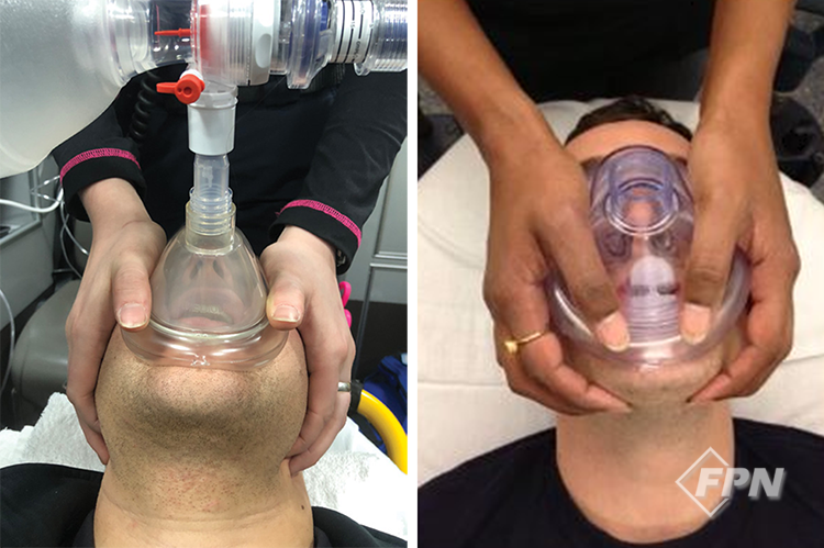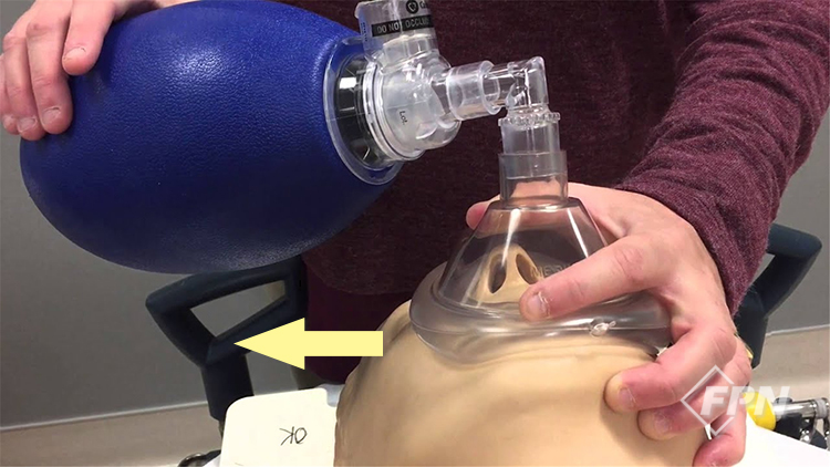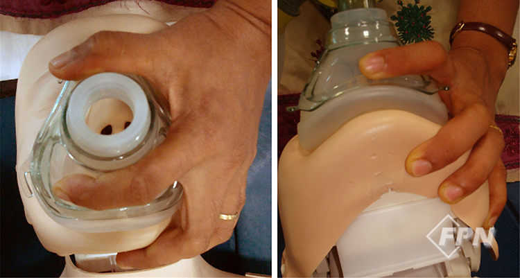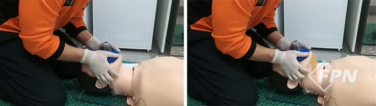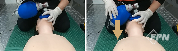 이런 경우 백을 오른손으로 가볍게 눌러 환자의 얼굴에 댄 상태로 환기를 제공하면 됩니다. 이렇게 하면 마스크의 오른쪽 부분도 충분한 밀폐력을 유지하게 돼 적절한 환기를 제공할 수 있습니다.