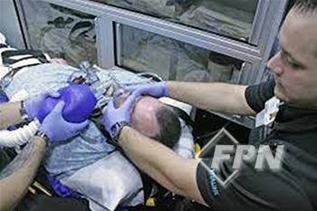 병원으로 이송 중인 구급차 내에서 환자의 의식과 분당 호흡수가 급격히 저하되면서 비정상 호흡을 하고 있습니다. 환자의 산소포화도는 60% 대로 떨어졌습니다. 여러분은 어떤 응급처치를 하시겠습니까?
