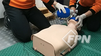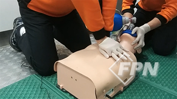 환자 머리에 위치한 구급대원은 양손으로 마스크를 잘 밀착시키고 흉부 압박을 시행하는 대원은 30번 흉부 압박 후 직접 2번의 환기를 제공합니다.