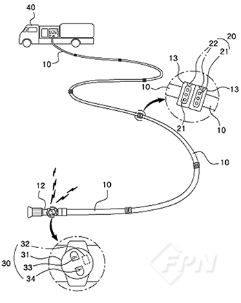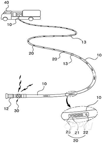 [도면 1]을 보면 소방호스(10)에 발광 모듈(20)이 점등된다. 발광 모듈 점등은 소방용 관창(12)의 제어 유닛(30)으로 이뤄진다.