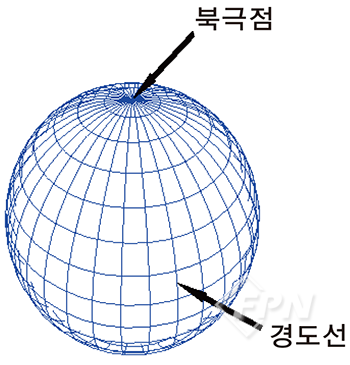 1. 진북(True North 또는 Geographic North 또는 Terrestrial North) 진북은 수평으로 북극점을 향하는 방향이다. [그림 1]과 같이 경위도 좌표계에서 경도선들은 위쪽으로 북극점을 향하기 때문에 모두 북극점에 모이게 된다. 그러므로 지도상에서 경도선들의 위쪽 방향이 정확한 진북이다.