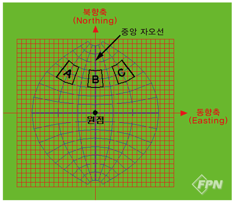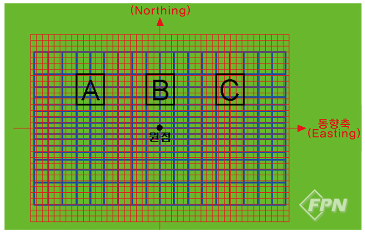 [그림 5]에서 불규칙한 간격의 파란색 선들은 경위도 좌표계를 평면에 횡축 원통 투영법인 횡단 머케이터(Transverse Mercator) 투영법으로 투영한 거다. 일정한 간격의 빨간색 선들은 평면직각 좌표계이며 A와 B, C를 감싼 검은색 선들은 일정 경위도 간격으로 분할된 도엽들의 도곽선이다.