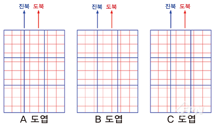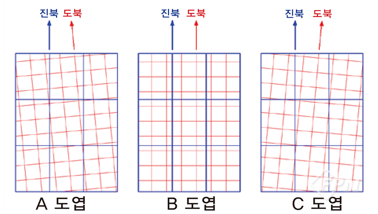 [그림 3]에서 파란색 굵은 선들은 경위도 좌표계를 평면에 정축 원통 투영법인 머케이터(Mercator) 투영법으로 투영한 거다. 빨간색 가는 선들은 평면직각 좌표계이며 A와 B, C를 감싸고 있는 검은색 선들은 일정 경위도 간격으로 분할된 도엽들의 도곽선이다. [그림 4]의 A와 B, C 도엽에서 진북과 도북 모두 수직 위쪽이다.