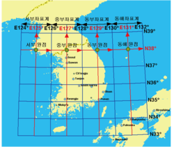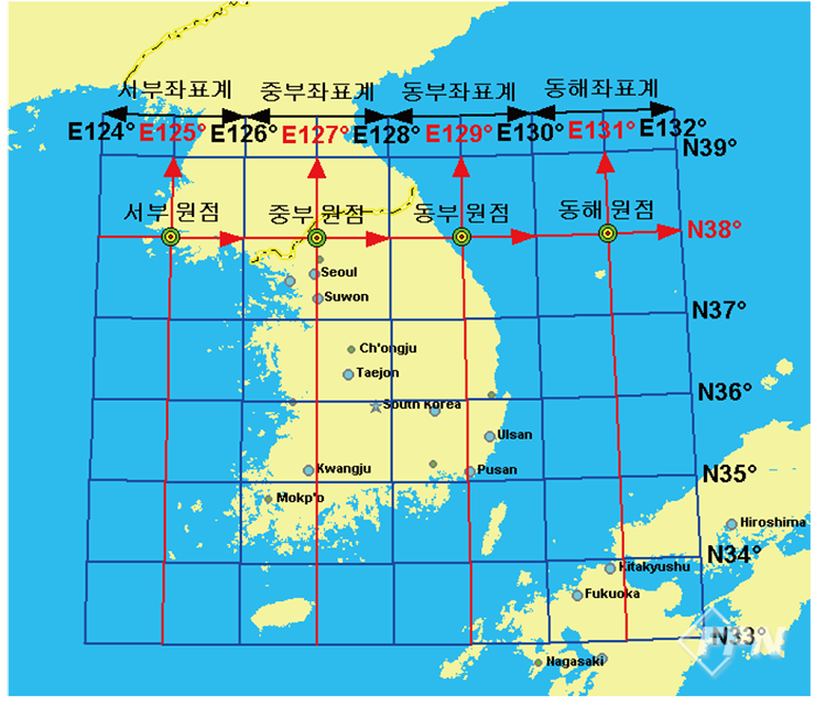 국토지리정보원의 국가 기본도는 [그림 8]과 같이 우리나라를 서부(E124~E126°), 중부(E126~E128°), 동부(E128~E130°), 동해(E130~E132°) 지역으로 구분해 각각 E125°, E127°, E129°, E131° 자오선을 중앙 자오선으로 횡단 머케이터 투영을 한 후 각 지역에 독립된 평면직각 좌표계를 만들었다.