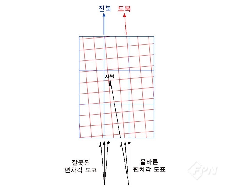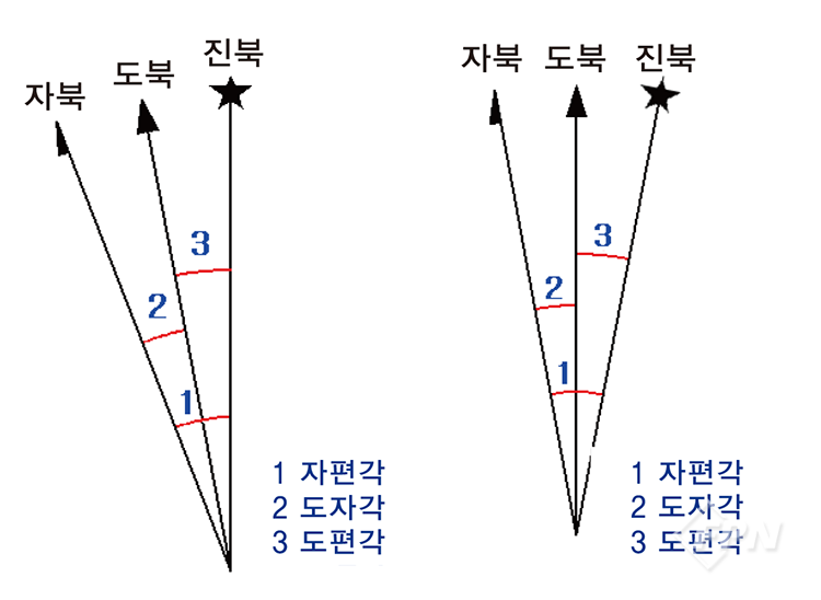편차각 진북, 도북, 자북 간의 방향 차이를 각도로 나타낸 거다. 편차각의 내용은 올해 4월호의 내용을 먼저 숙지한 후 본다면 훨씬 이해가 잘 될 거다.