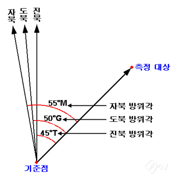 방위각(Azimuth or Bearing) 방향을 좀 더 정밀하게 표현해야 하는 측량이나 천문학, 항공기ㆍ선박의 항법, 독도법, 포술 등에서 방위각을 사용한다. 방위각이란 방향을 각도로 나타낸 방향 문자다. 이는 북쪽을 기준 방향으로 하면서 시계 방향으로 각도를 부여한다.