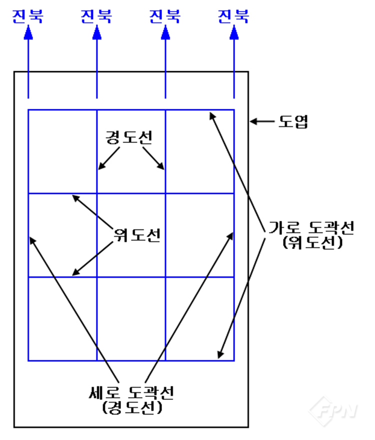 넓은 지역의 지도는 일반적으로 일정 경위도 간격으로 분할해 여러 도엽으로 나눔으로써 지도 취급을 편리하게 한다. 그러므로 [그림 2]와 같이 도엽의 지도란에서 상하의 가로 도곽선은 위도선이며 좌우의 세로 도곽선은 경도선이다. 도엽에서 수직 방향의 세로 도곽선이 바로 경도선이므로 도엽의 수직 위쪽이 진북이다.