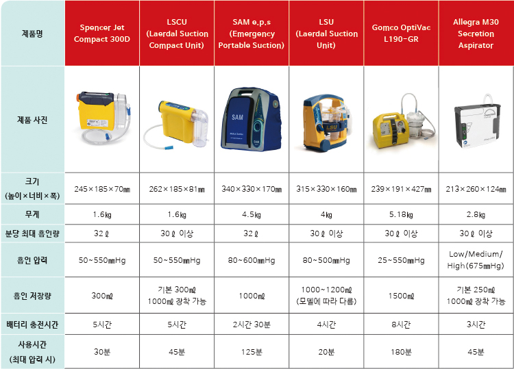 현장에 맞는 흡인기 선택 대부분의 응급의학 서적에선 익수 환자의 경우 250~300㎖ 정도의 액체가 폐로 들어간다고 안내하고 있습니다. 하지만 현장에서 많은 환자를 만나본 결과 300㎖ 이상의 흡인을 해야 하거나 다량의 분비물, 이물질로 인해 환기 저항이 발생했습니다. 이로 인해 적절한 산소공급이 되지 않을 때가 많았습니다. 특히 목욕탕이나 수영장, 강, 바다에서 발생한 익수환자 또는 심정지 환자의 경우 구강 내에 다량의 액체가 있을 때가 많았습니다. 특히 식사한 지 시간이 많이 지나지 않았다면 위장 내 소화물도 다량 역류하게 될 겁니다.