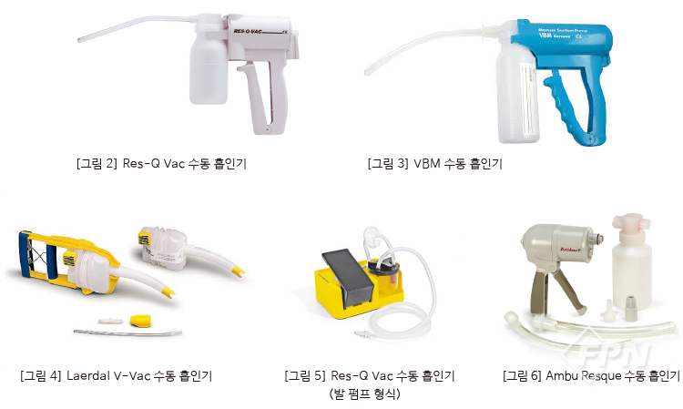 흡인기의 종류 구급대에 보급된 흡인기는 손이나 발을 사용한 수동식 흡인기와 배터리로 작동하는 휴대용 자동식 흡인기로 나눌 수 있습니다.