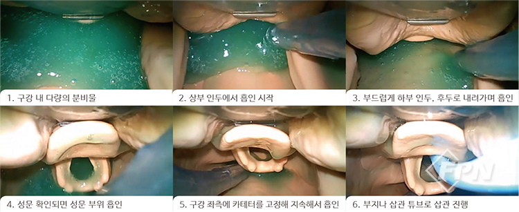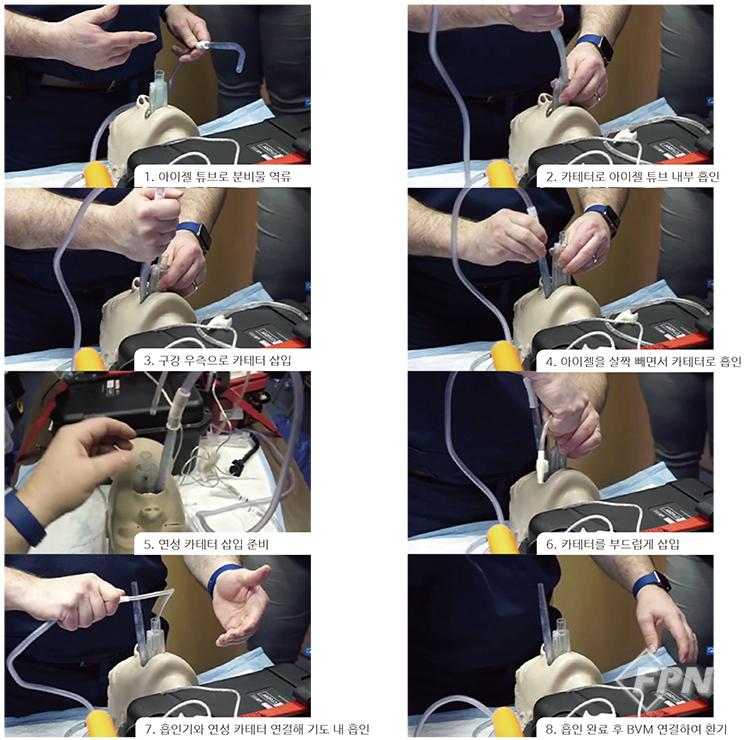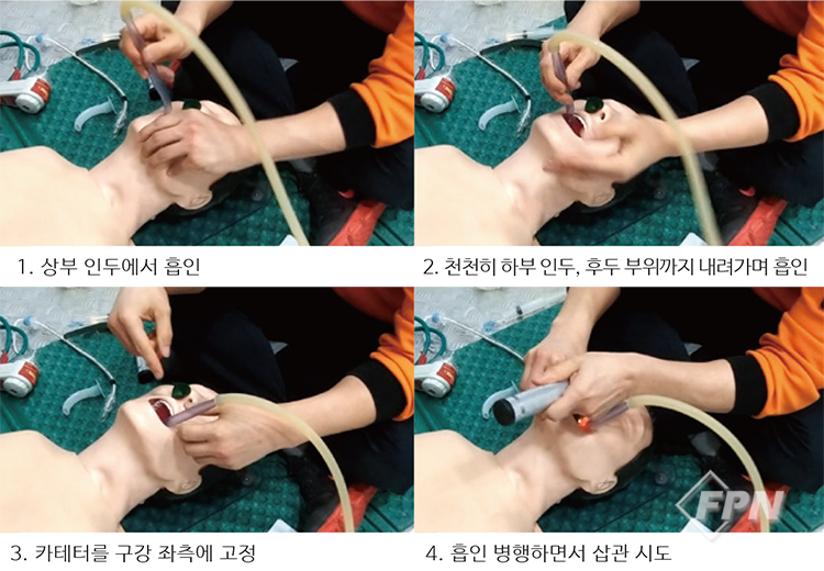 처음부터 너무 깊이 카테터를 넣지 말고 구강 내부의 얕은 곳이나 상부 인두에서 흡인을 시작해 시야를 확보합니다. 이후 부드럽게 아래쪽, 하부 인두와 후두 부위로 카테터를 이동시키며 흡인을 합니다. 구강 내부가 어느 정도 정리됐으면 카테터를 구강 좌측에 놓고 후두경으로 삽관을 시도합니다. 필요하면 환자 성문 부위도 가볍게 흡인을 해 기도 내 오염을 막아주며 시야를 확보해 줍니다. 성문이 확인된다면 부지 또는 기관 내 삽관 튜브를 삽입해 기도를 오염원으로부터 빠르게 분리해줍니다.