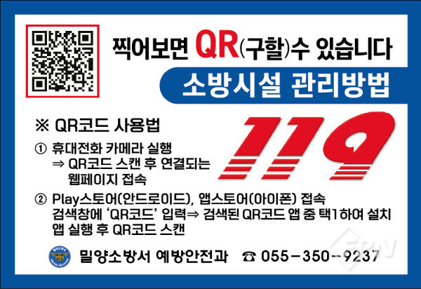 [FPN 정현희 기자] = 밀양소방서(서장 손현호)는 지난달부터 QR코드 스티커를 제작해 관내 2급대상물 471개소ㆍ전통시장에 배부한다고 밝혔다.