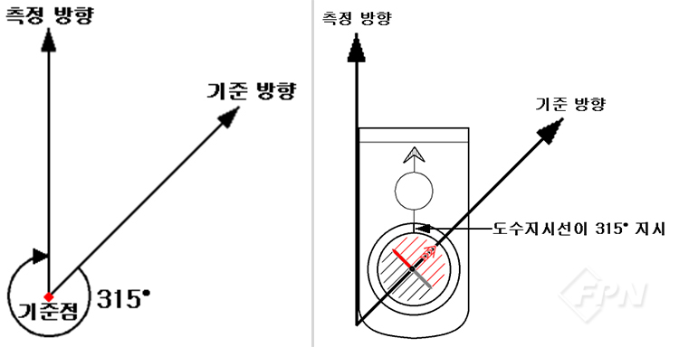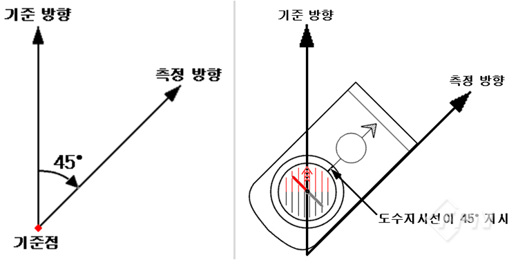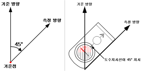 현장에서 나침반으로 방위각을 측정할 땐 적침 방향이 기준 방향이 되므로 북방지시화살표(또는 보조선)가 적침 방향과 같은 방향이 되도록 다이얼을 돌린다.