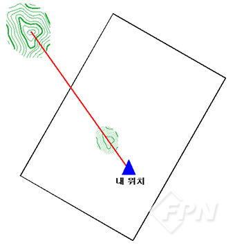 [그림 4]와 같이 지도상의 내 위치에서 지도상의 기지점으로 가상의 직선을 그리고 그 직선의 연장선이 현장의 기지점을 가리키도록 지도를 돌려놓으면 지도정치가 된다.