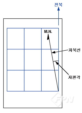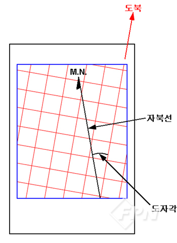 [그림 7]과 같이 평면 직각 좌표계가 표시된 군사지도나 외국의 지형도에 자북선을 그리려면 도북(북향축의 방향)에 대해 자북이 얼마나 기울었는지, 즉 그 지역의 도자각이 얼마인지 파악해야 한다.
