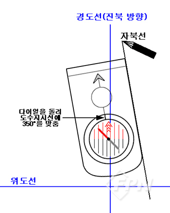 그런 다음 [그림 8]과 같이 기준 방향을 가리켜야 하는 북방지시화살표(또는 보조선)가 진북(경도선)과 평행한 방향이 되도록 지도상에 놓으면 나침반의 진행선(또는 측변)은 진북 방위각 350°의 방향, 즉 자북의 방향을 가리킨다. 따라서 나침반의 측변을 따라 선을 그리면 바로 자북선이 된다.