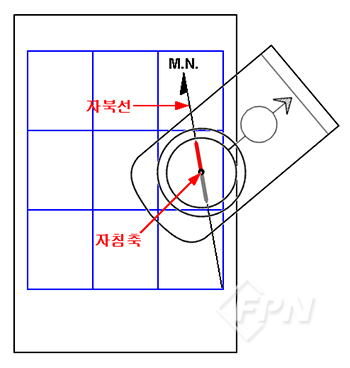 하지만 지도에 자북 방향이 별도로 표시돼 있지 않기 때문에 사용자가 직접 지도에 자북선을 그려 자북의 방향을 표시해 둬야 한다.