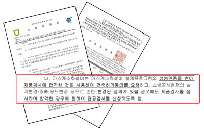 이에 따라 건축허가동의시에 가스계소화설비 성능인증 프로그램에 대한 ‘성능인증서’를 첨부토록 하고 설계심사 결과는 소방시설의 착공신고시 제출토록 하는 것이 가장 합리적인 방안이 될 수 있을 것으로 보여진다.