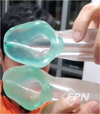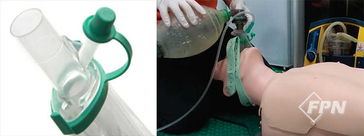 산소 공급 포트의 캡을 열고 산소 공급용 라인을 연결하면 백 밸브 마스크에 저장낭을 부착하지 않고도 100% 산소를 공급할 수 있는 장점이 있습니다. 분당 최대 8ℓ의 산소 공급이 가능합니다. 호흡기 쪽에서 분비물이 계속 발생하면 산소 공급 포트에 흡인기를 연결해 흡인을 제공할 수도 있습니다.