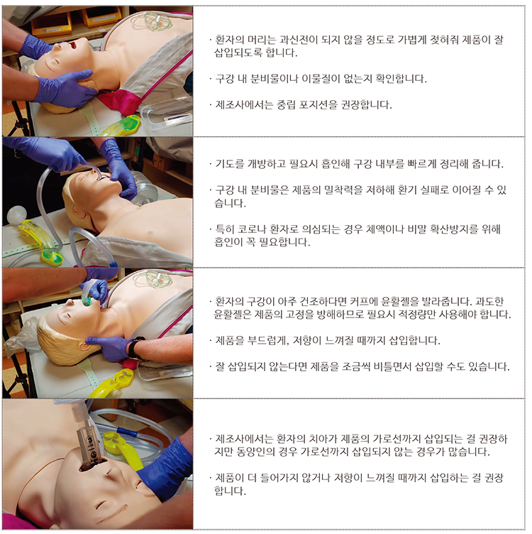 공기를 주입할 필요가 없고 후두의 해부학적 구조를 본 따 최대한 성문상부를 잘 밀폐할 수 있도록 디자인됐습니다. 빠른 삽입이 가능하며 누구나 쉽게 전문기도확보를 할 수 있습니다.