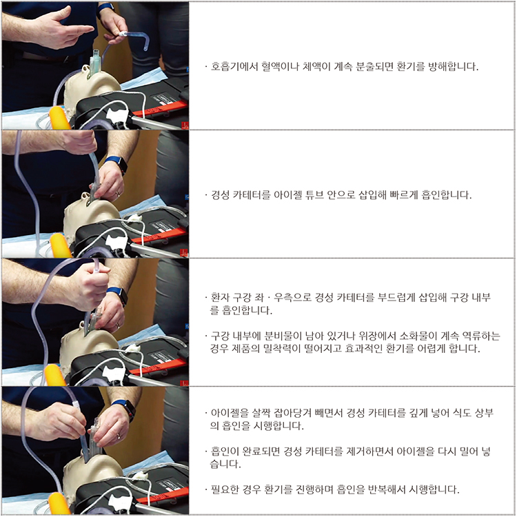 ㆍ아이젤로 원활한 환기가 지속되지 않는 경우 ㆍ비디오 후두경 없이 기관 내 삽관을 해야 하는 경우 ㆍ구강 내 분비물이 많지만 휴대용 흡인기가 없는 경우 ㆍ구토물이 계속 역류해 빠른 기도 보호가 필요할 때 ㆍ후두경을 사용한 기관 내 삽관이 어려운 경우