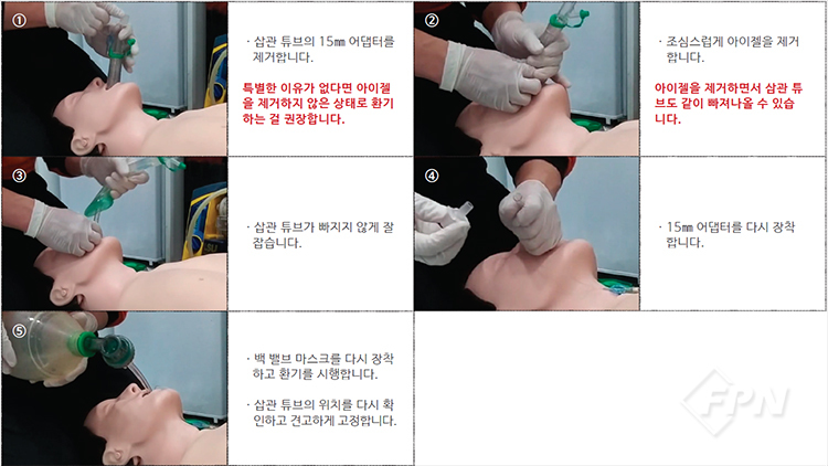 만약 환자가 자발 호흡이 회복된 상태라면 환기를 중단해도 지속적인 산소 공급이 가능하므로 무리하게 아이젤을 제거하지 않아도 됩니다. 원칙적으로 기관 내 삽관 튜브나 아이젤을 제거할 땐 의사의 지시가 필요합니다.