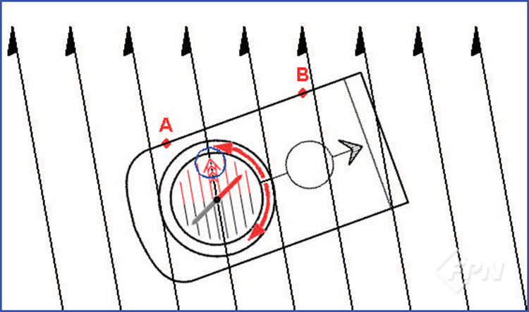 이때 적침이 북방지시화살표보다 오른쪽으로 치우칠 경우 적침과 북방지시화살표의 방향이 일치할 때까지 진행선의 왼쪽 방향으로 이동해야 한다.