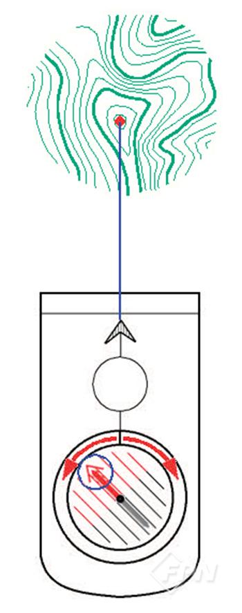 현장의 내 위치에서 시야에 관측되는 지점의 방위각을 측정하려면 [그림 2]와 같이 먼저 진행선이 해당 지점(측정 방향)을 향하도록 맞춘 후 그 상태로 다이얼을 돌려 북방지시화살표가 적침 방향(기준 방향)과 일치되게 한다.