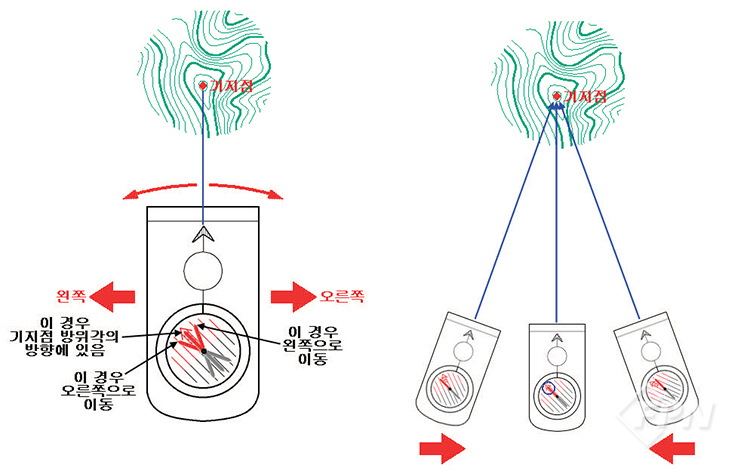 이렇게 하면 진행선의 전방이 미지점 방위각의 방향이며 해당 방향에 미지점이 위치한다.