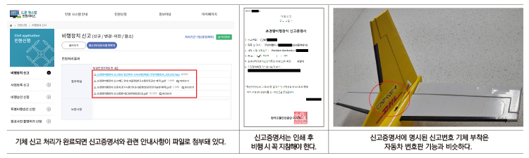 그중 발급된 신고증명서는 인쇄 후 해당 기체 비행 시 필수로 지참해야 하며 신고번호 또한 규정 양식에 맞게 기체의 정해진 위치와 크기로 표시해야 한다.