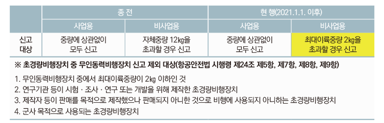 결국 취미ㆍ레저용으로 즐기는 소형 기체도 안전한 제도권으로 안착시키려는 방안을 마련해야만 했다. 이에 따라 2021년 1월 1일부터 비사업용 드론 기체의 신고(등록) 기준이 기존 자체중량 12㎏ 초과에서 최대이륙중량 2㎏으로 대폭 변경됐다. 사업용 기체는 기존과 같이 중량에 상관없이 모두 신고 대상이다.