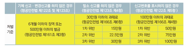 만약 기체 신고에 대해 안이하게 생각하거나 실수로 기체 신고를 하지 않고 비행할 경우 6개월 이하의 징역 또는 500만원 이하의 벌금에 처할 수 있다. 신고 후 부여되는 신고번호를 표시하지 않고 비행했을 때도 100만원 이하의 과태료 부과 대상이다.