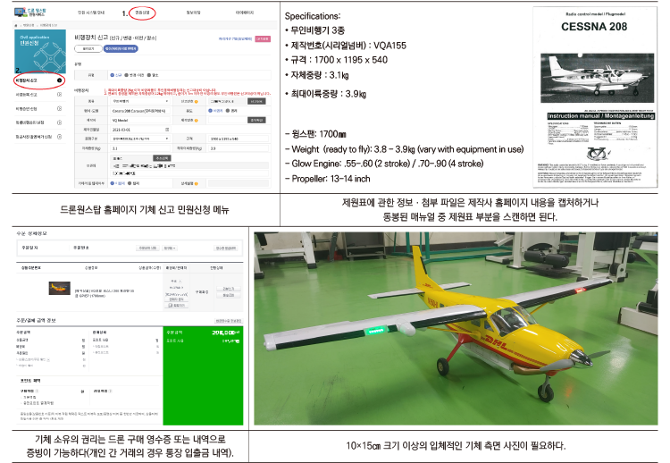 다만 기체를 신규로 신고하려면 최대이륙중량 등 기체 정보가 있는 제원표(매뉴얼)와 구매 영수증 등 기체를 소유하거나 사용할 권리가 있음을 증명할 수 있는 서류, 구매 또는 조립 후 소유한 기체를 직접 촬영한 사진을 반드시 첨부해 제출해야 한다.