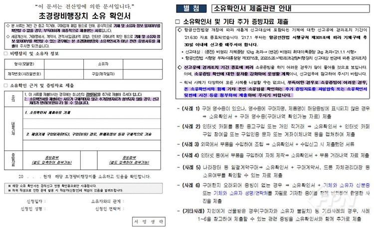 21년 7월1일부터 기체신고 시 소유 확인서 강화 기체 신고 유예기간이 2021년 6월 30일 부로 종료됨에 따라 기체 소유증명에 대한 확인 절차가 강화되었다. 종전에는 과거 구매한 경우 등 소유증빙이 어려운 경우, 별도 소유확인서(공단 서식)로 해당 기체의 소유증빙을 대체 했지만 7월 1일 부터 소유확인서(공단 서식) 이외의 별도(하단 참조) 소유증빙 자료를 추가로 제출해야 한다.