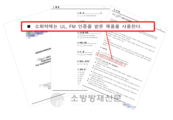| ▲ S사의 청정소화약제소화설비 설계 및 시공 메뉴얼에는 '소화약제는 UL, FM 인증을 받은 제품을 사용한다.'라는 문구가 적시돼 있다. © 최영 기자 | |