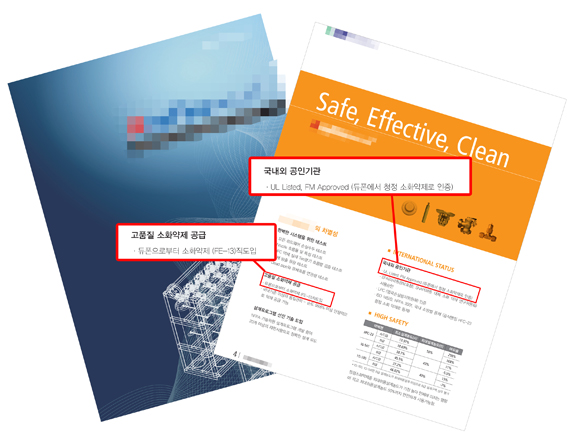 | ▲ S사의 영업에 사용되는 카다로그에는 듀폰으로부터 소화약제 직도입, UL, FM인증 등의 문구가 적시되어 있다. ©최영 기자 | |
