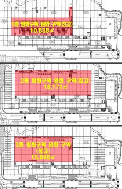 ![]() ▲ 방화구획을 대폭 완화받은 쿠팡 물류창고 지상층 도면 © 국회 서영교 행정안전위원장실 |
