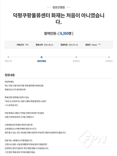 지난 21일 청와대 국민청원에는 “최초 신고자보다 더 빨리 화재를 발견한 노동자”라며 쿠팡 측의 화재 당일 부실한 대처를 고발하는 글이 올라왔다.