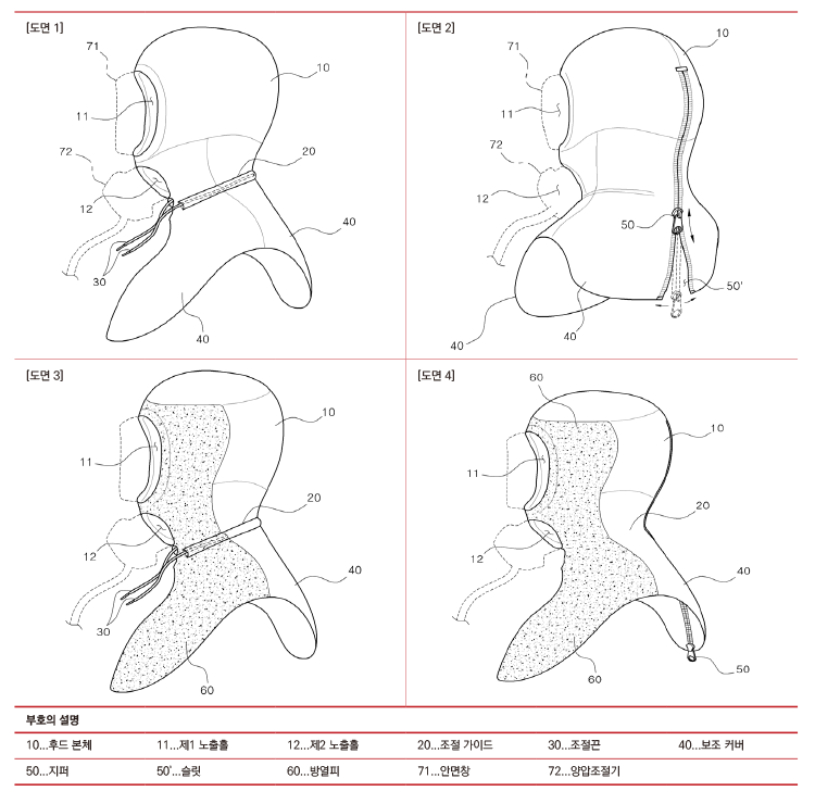 [도면 2]와 같이 후드 본체와 보조 커버에 걸쳐 형성된 슬릿(50')에는 이 슬릿을 개폐하는 지퍼(50)를 달아 사용자의 착용상 편의를 도모하는 실시 예를 적용할 수 있다.