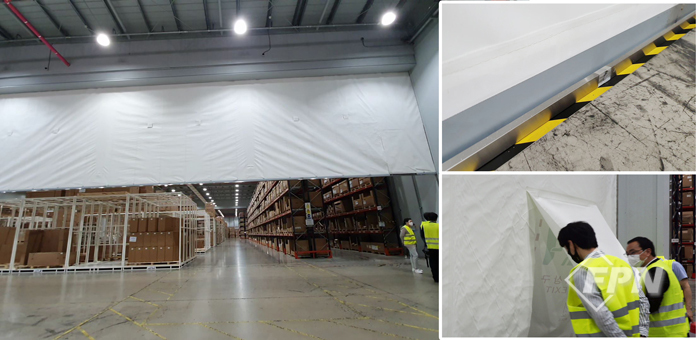 창고시설 내 방화구획 설정을 위한 방화셔터는 실리카 내화 섬유 원단이 적용된 스크린을 적용했다. 실리카 섬유는 1천℃가 넘는 고온에서 노출돼도 견딜 수 있는 특수 재질로 알려진다. 1시간 이상의 방화성능을 내며 고열에 의해 비틀어지거나 연기가 새는 현상이 없어 철제 셔터 방식보다 비교적 안전하다.