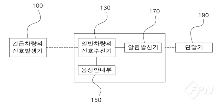 발명의 내용 이 발명은 긴급차량에 장착돼 긴급 상황에서 특정 주파수를 발신하는 신호 발생기와 내비게이션 또는 내비게이션 기능을 갖춘 단말기에 구비된다. 긴급차량이 일정한 범위 안에 접근하면 긴급차량으로부터 발신되는 신호를 수신하는 신호수신기와 운전자에게 긴급차량의 접근 여부를 알려주는 음성 안내부를 포함할 수 있다.