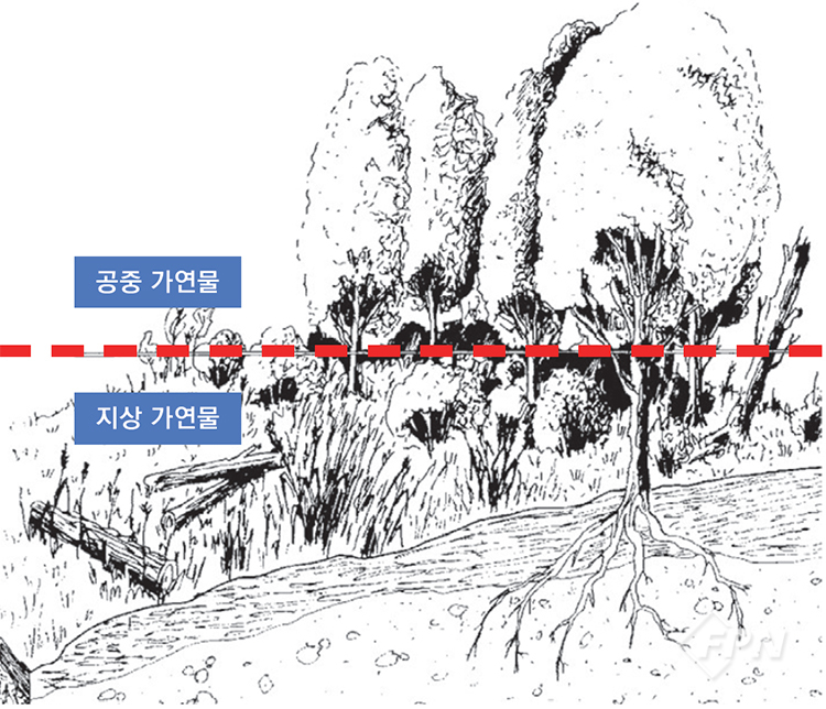 위 그림에서는 빨간색 중심선을 기준으로 지상 가연물과 공중 가연물로 나눌 수 있다. 지상 가연물은 퇴적잎과 뿌리, 잔가지, 잔디, 죽은 나무 등이 있다.