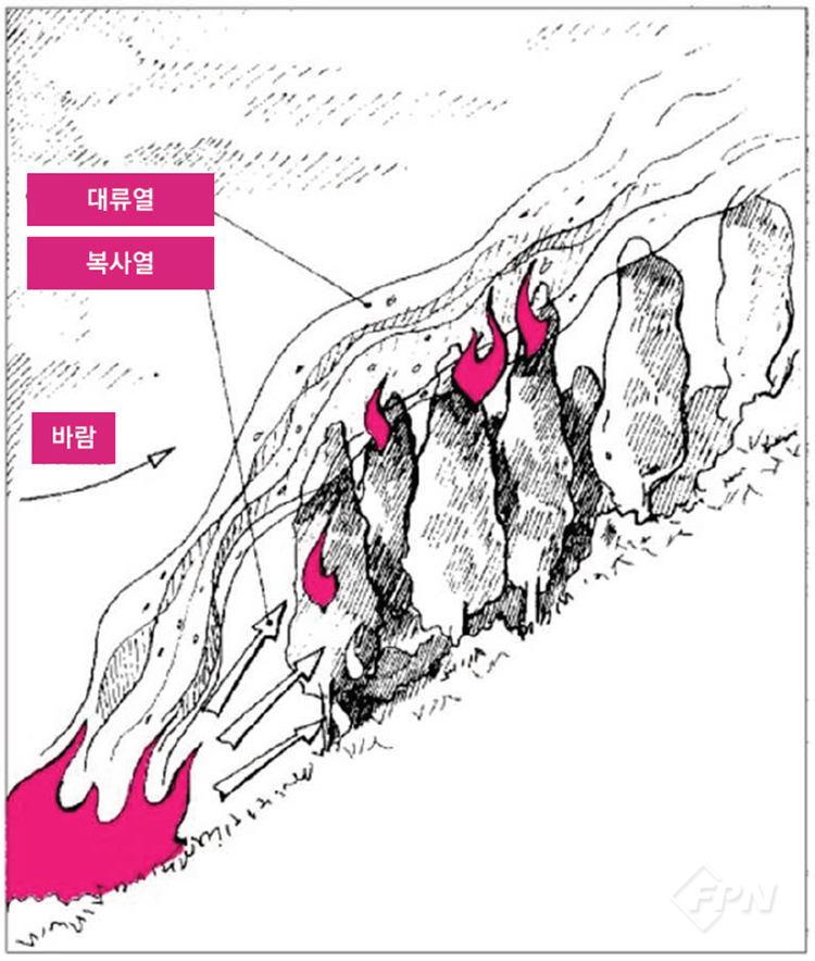 위 그림을 보면 바람이 없는 조건에서 화재가 발생했을 때 지형이나 가연물의 종류에 따라 어느 방향으로 화재가 진행될지 예측할 수 있다.