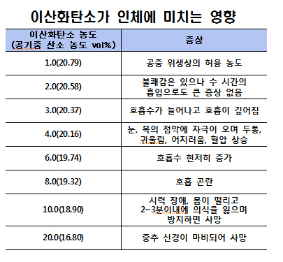 이산화탄소 자체는 무독성 기체로 분류되지만 직접 흡입할 경우 치명적인 피해로 이어진다. 이산화탄소 자체가 공기 중 10%만 포함되더라도 시력장애를 시작으로 몸이 떨리게 되며 2~3분 이내 의식을 잃고 그대로 방치하면 사망에 이른다. 20% 이상일 땐 중추 신경 마비로 단시간 내 사망할 수 있다.