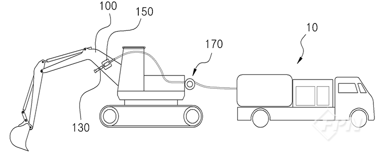 이때 굴삭기 후방에는 방수관창에 연결된 소방호스를 감는 릴통(170)이 더 갖춰질 수 있으며 릴통은 소정의 범위 내에서 태엽장치(미 도시) 등에 의해 풀렸다가 감겼다가를 반복할 수 있다.