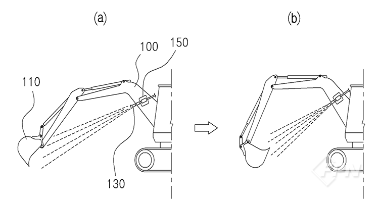 방수관창은 버킷이 특정 위치에 오거나 특정 영역에 있을 때만 물을 분사하도록 할 수 있다. 예를 들어 방수관창은 버킷이 붐 방향으로 접힐 때만 물을 분사하도록 할 수 있고([도면 2]의 (b)) 붐의 반대방향으로 펴질 때만 물을 분사하도록 할 수 있다([도면 2]의 (a)). 특정 지점이 아니라 일정한 범위에 있을 때만 물을 분사하도록 할 수도 있다.