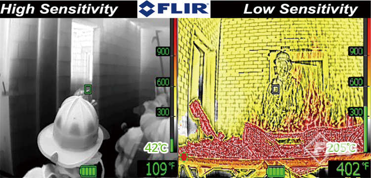 열화상카메라의 온도 민감도 TIC도 너무 뜨거운 환경에서는 오작동을 일으킵니다. 소방용 TIC는 대부분 고감도(high sensitivity)와 저감도(low sensitivity) 모드의 두 가지 온도측정 방식을 갖고 있습니다(ARGUS-4 320처럼 때로는 high, midium, low의 tri mode도 있음). 제조업체에서 사전 결정된 조건에 따라 자동으로 고감도나 저감도로 전환됩니다.
